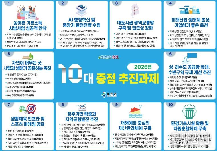 동네방네 김형규 기자 | 옥천군이 26일 2026년 군정 운영의 핵심 방향을 담은 10대 중점 추진과제를 발표하고, 군민 삶의 질 향상과 지속가능한 지역성장을 위한 정책 추진에 나선다.
