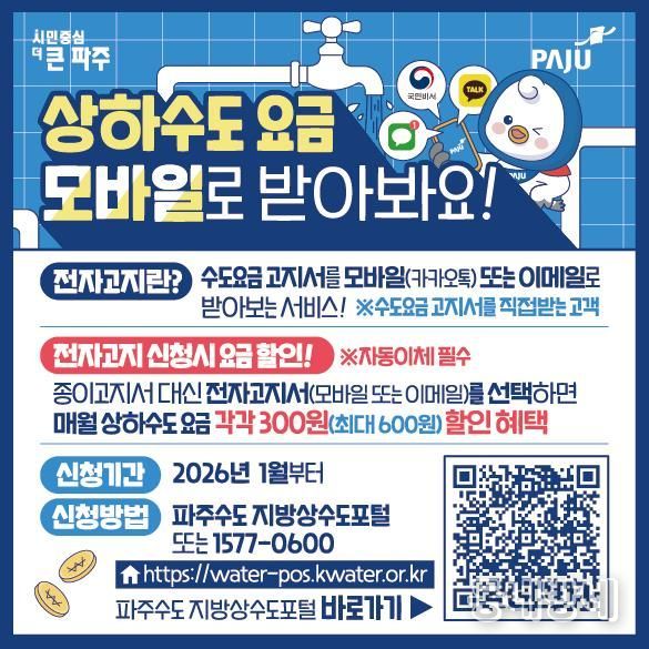 동네방네 김형규 기자 | 파주시는 2026년 1월부터 수도요금 전자고지와 자동납부를 동시에 신청하는 시민에게 수도요금을 할인하는 제도를 시행한다고 밝혔다.