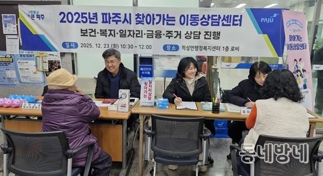동네방네 김형규 기자 | 파주시는 지난 23일 적성면 행정복지센터에서 정보 취약계층을 대상으로 보건, 복지, 일자리, 금융, 주거 등 5개 분야를 한자리에서 상담하는 ‘찾아가는 이동상담센터’를 운영했다고 밝혔다.