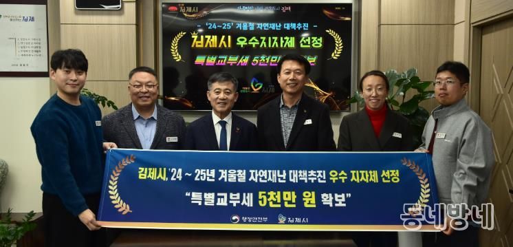 동네방네 김형규 기자 | 김제시는 지난 24일 행정안전부가 주관한 자연재난 대책 추진 평가에서 우수 지방자치단체로 선정돼 특별교부세 5천만 원을 지원받는다고 밝혔다.