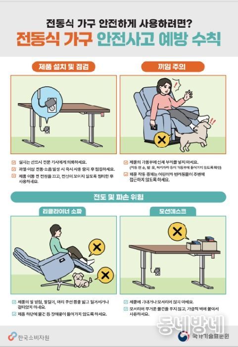 동네방네 김형규 기자 | 산업통상부 국가기술표준원은 전동식 가구로 인한 안전사고를 사전 예방하기 위해 안전 사용 수칙을 안내하는 홍보 캠페인을 실시한다.
