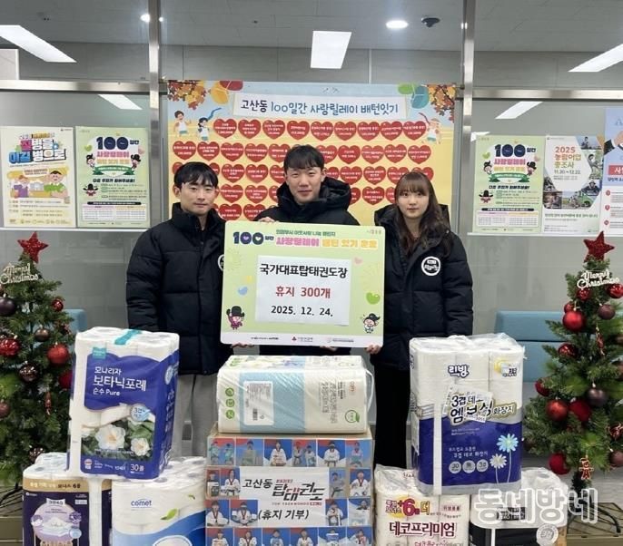 동네방네 김형규 기자 | 의정부시 고산동주민센터는 12월 24일 고산동 소재 국가대표 탑 태권도장이 지역 저소득층을 위해 두루마리 화장지 300개를 기부했다고 밝혔다.