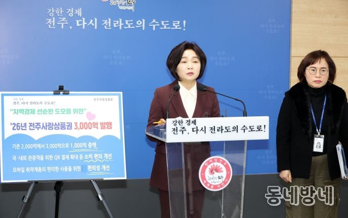 동네방네 김형규 기자 | 전주시가 2026년 병오년 새해부터 장기화된 경기 침체와 고물가 등으로 어려움을 겪는 소상공인과 지갑이 가벼워진 시민을 위해 전주사랑상품권을 50% 증액해 발행키로 했다.