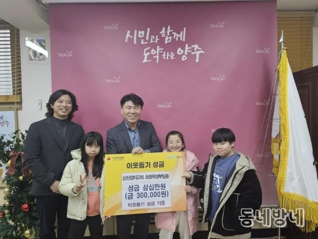동네방네 김형규 기자 | 양주시 남면 신산감리교회 초등부 4학년반 학생들은 지난 23일 남면 행정복지센터를 방문해 이웃돕기 성금을 전달하며 이웃사랑 실천에 앞장섰다.