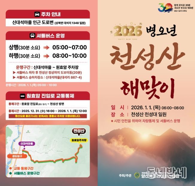 행사 주최 측에서는 “양산시와 협의하여 안전을 최우선으로 삼았으며, 셔틀버스 운행시간에 유의하시어 해맞이 행사를 즐겁게 관람하러 오시길 바란다”고 전했다.