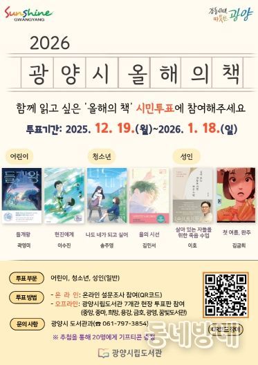 동네방네 김형규 기자 | 광양시가 오는 12월 29일부터 내년 1월 18일까지 ‘2026 올해의 책’ 선정을 위한 시민투표를 실시한다.
