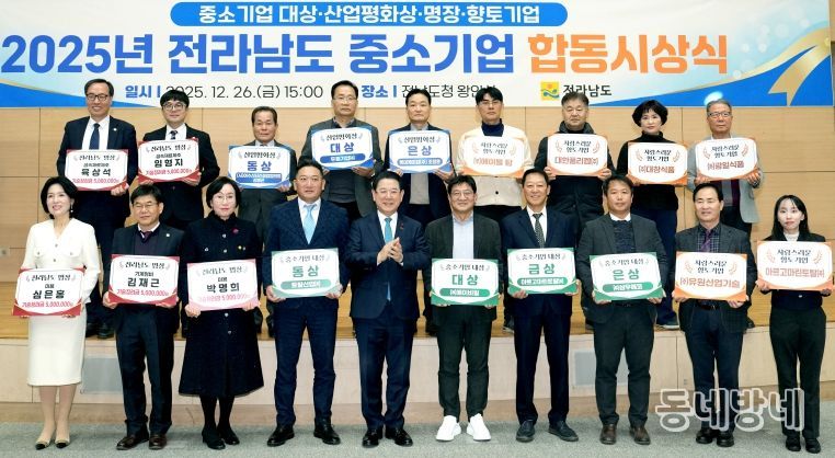 동네방네 김형규 기자 | 전라남도는 26일 중소기업의 성장과 산업현장 숙련기술인의 공로를 기리기 위해 ‘2025 중소기업 합동 시상식’을 열고 기업경영·노사화합·숙련기술 등 각 분야에서 우수한 성과를 거둔 기업과 개인을 시상했다.