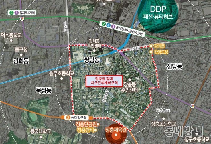 장충동 일대 지구단위계획구역은 40만7천329㎡ 규모로, 지하철 2·3·4·5호선(동대문역사문화공원역, 동대입구역)이 지나는 뛰어난 교통 여건을 갖추고 있다. 동대문디자인플라자(DDP), 장충체육관, 중앙아시아거리, 광희문, 다산성곽 등과 인접해 문화·관광·상업인프라도 풍부하다.