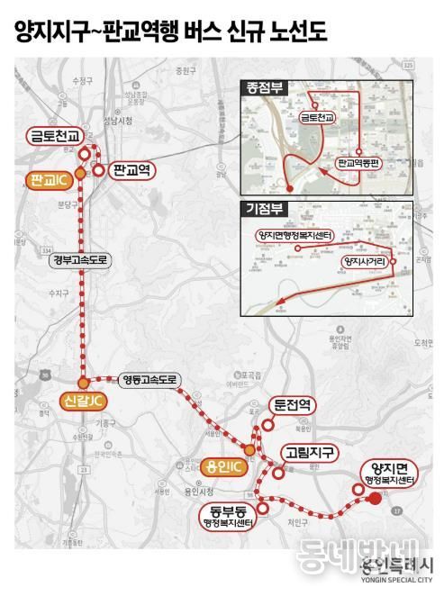 동네방네 김형규 기자 | 용인 양지지구를 출발해 고림동과 둔전역을 거쳐 성남 판교역까지 운행하는 버스 노선이 확정됐다.