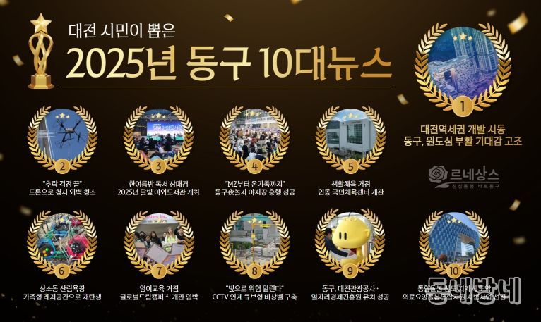 동네방네 김형규 기자 | 대전 동구는 주민들이 직접 참여하고 동구GPT 분석을 통해 선정한 ‘2025년 동구 10대 뉴스’ 투표 결과, ‘대전역세권 개발 시동’이 압도적인 1위를 차지했다고 29일 밝혔다.