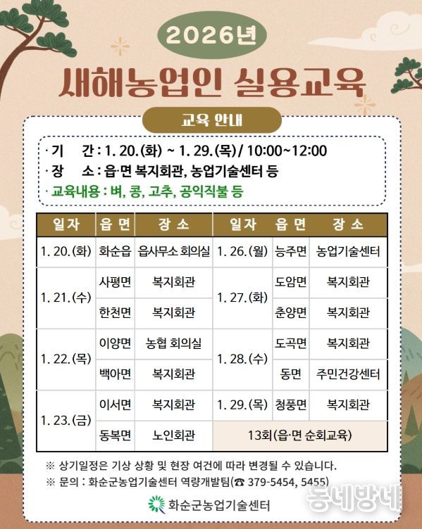 동네방네 김형규 기자 | 화순군은 2026년 1월 20일부터 1월 29일까지 관내 농업인을 대상으로 2026년 새해농업인실용교육을 실시한다고 밝혔다.