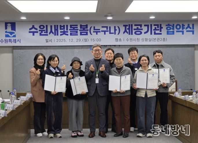 동네방네 김형규 기자 | 수원특례시이 29일 시청 상황실에서 ‘수원새빛돌봄(누구나) 서비스 제공기관 재협약 협약식’을 열고, 서비스 제공기관들과 재협약을 체결했다.