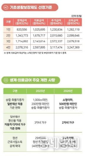 2026년 1인 가구의 중위소득은 2025년 239만 2013원 대비 7.20% 인상된 256만 4238원으로 기초생활보장 수급 가구의 대다수를 차지하는 1인 가구 대상에는 보다 높은 인상률이 적용됐으며, 생계급여 선정기준은 1인 가구 5만 5000원, 4인 가구 12만 7000원 인상돼 생활 수준이 향상될 것으로 기대된다.