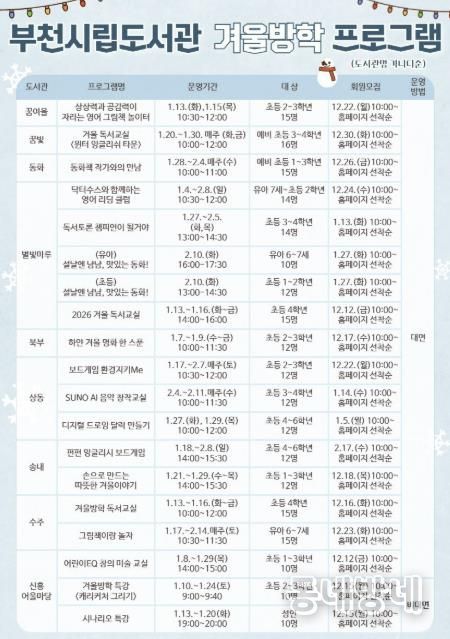 동네방네 김형규 기자 | 부천시는 겨울방학을 맞아 내년 1월부터 2월까지 부천시립도서관에서 전 연령을 대상으로 독서문화 프로그램과 행사를 운영한다고 30일 밝혔다. 이번 프로그램은 연령과 관심사에 따라 다양한 참여 기회를 제공하기 위해 마련됐다.