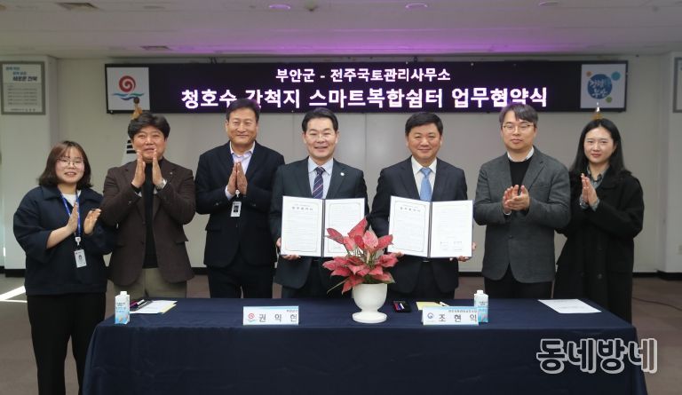 동네방네 김형규 기자 | 부안군은 익산지방국토관리청 전주국토관리사무소와 부안 청호수 간척지 스마트복합쉼터 조성사업의 원활한 추진을 위한 업무협약(MOU)을 체결했다고 밝혔다.