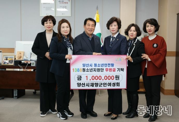 동네방네 김형규 기자 | 양산시 재향군인여성회(회장 전정애)는 30일 양산시를 방문해 후원금 100만 원을 양산시청소년상담복지센터 1388청소년지원단에 기탁했다.