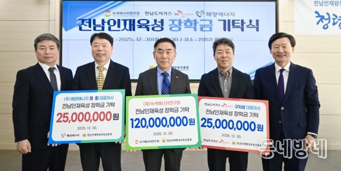 동네방네 김형규 기자 | 전라남도는 30일 인재육성 장학금으로 (재)녹색에너지연구원이 1억 2천만 원, 전남도시가스(주)가 2천500만원, ㈜해양에너지가 2천500만 원을 전남인재평생교육진흥원에 기탁했다고 밝혔다.