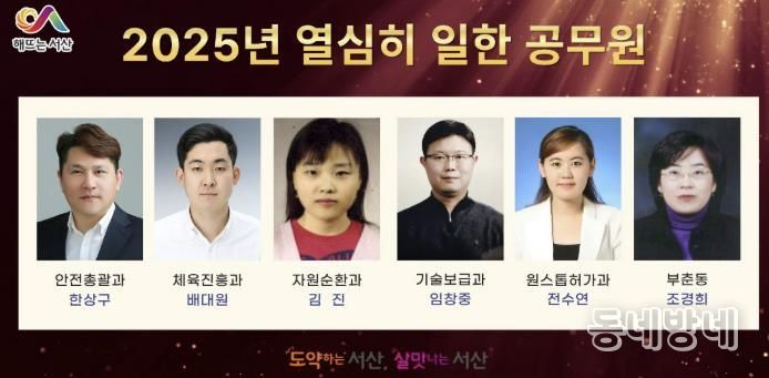 동네방네 김형규 기자 | 충남 서산시는 올해 시정 발전과 시민 삶의 질 향상을 위해 노력한 공무원 6명을 ‘열심히 일한 공무원’으로 선정했다고 밝혔다.