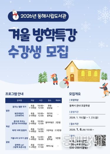 동네방네 김형규 기자 | 동해시는 2026년 겨울방학을 맞아 관내 초등학생을 대상으로 동해시립도서관에서 겨울방학 특강 프로그램을 운영한다고 밝혔다.