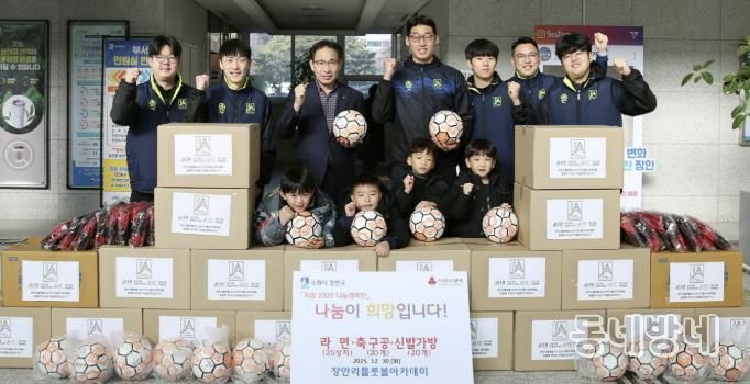 동네방네 김형규 기자 | 수원시 장안구는 장안리틀풋볼아카데미가 지난 30일 장안구청에 라면 25상자와 축구공 20개 기부했다고 밝혔다. 이번 기부는 아카데미 회원들이 십시일반으로 정성을 모아 마련한 것으로, 장안구 관내 어려운 이웃들에게 전달될 예정이다.
