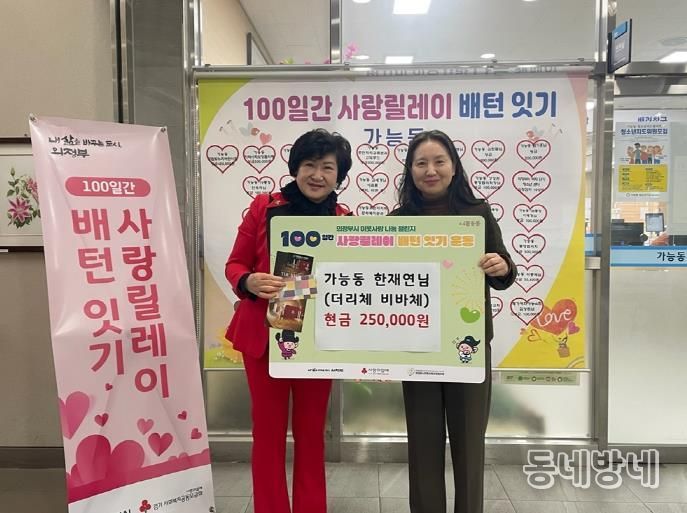 동네방네 김형규 기자 | 의정부시 가능동주민센터는 12월 29일 더리체 비바체가 관내 어려운 이웃을 돕기 위해 성금 25만 원을 기탁하며 ‘100일간 사랑릴레이 배턴 잇기’에 동참했다고 밝혔다.