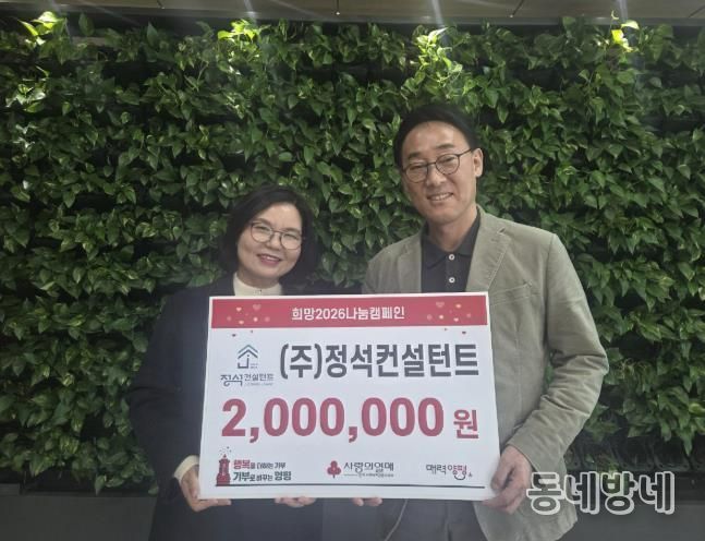 정연태 ㈜정석컨설턴트 대표는 “도시계획 분야에 종사하는 기업으로서 현장에서 접하는 지역의 생활 여건과 어려움에 관심을 가져왔다”며 “추운 겨울을 앞두고 도움이 필요한 이웃들에게 조금이나마 온기가 전해지기를 바라는 마음으로 기탁을 결정했다”고 말했다.