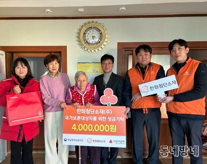 다양한 사회공헌으로 지역사회의 나눔문화를 선도하는 한화첨단소재는 올해 6월 호국보훈의달 맞이 보훈대상자 지원사업에 이어 연말에도 충남동부보훈지청과 연계하여 따뜻한 겨울을 보내실 수 있도록 물품을 전달하며 감사의 마음을 전했다.