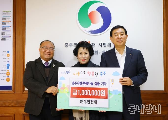동네방네 김형규 기자 | 충주시는 지역기업 우진건재가 시청을 방문해 어려운 이웃을 위한 ‘충주사랑행복나눔’ 기금 100만 원을 기탁했다고 2일 밝혔다.