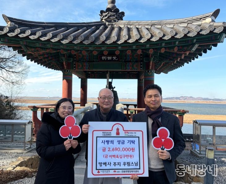 동네방네 김형규 기자 | 김제시 진봉면 행정복지센터는 지난 12월 31일, 국가자연유산 명승 김제 망해사(주지 우림스님)가 소외된 계층을 돕기 위해 성금 269만 원을 기탁했다고 밝혔다.