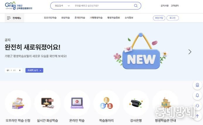 동네방네 김형규 기자 | 가평군이 올해부터 군민 모두가 함께 배우고 성장하는 평생학습도시 조성을 목표로 평생학습 홈페이지를 전면 개편해 새롭게 운영한다. 온라인 기반 학습 환경을 강화하고 교육 참여 기회를 확대하기 위한 조치다.