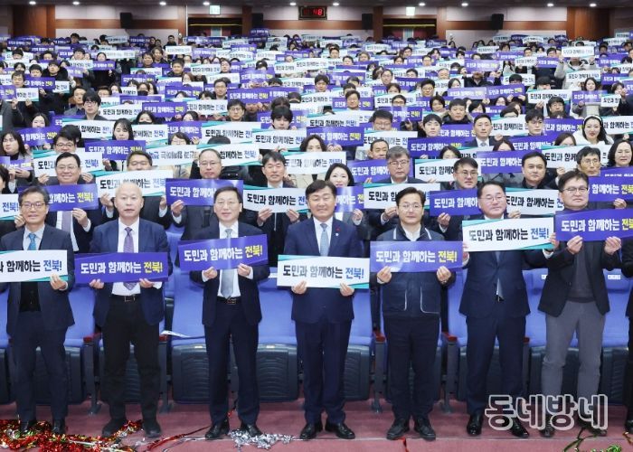 시무식 마무리에서는 전 직원이 '도민과 함께하는 전북'이라는 문구가 적힌 피켓을 일제히 들어 올렸다. 2026년 도정 사자성어 '여민유지(與民由之·백성과 더불어 함께한다)'의 의미를 되새기며 새해 도정에 대한 공감과 다짐을 함께했다.