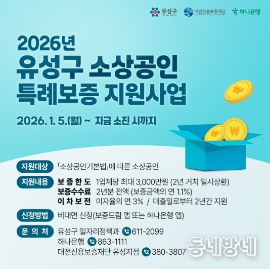 동네방네 김형규 기자 | 대전 유성구는 소상공인과 창업 기업의 금융 부담 완화를 위해 ‘2026년도 소상공인·창업 특례 보증 지원 사업’을 운영한다.