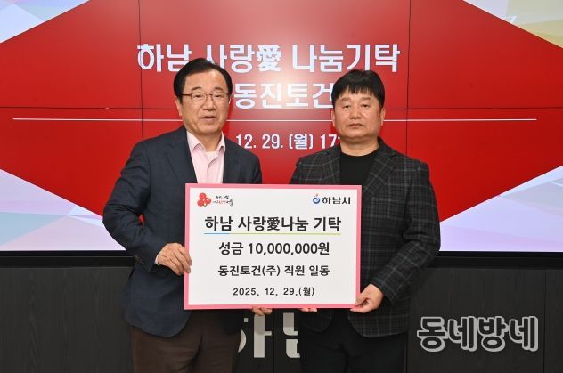 하남시 관계자는 “지역의 미래를 위한 뜻깊은 나눔에 동참해주신 ㈜동진토건에 감사드리며, 기탁자의 뜻에 따라 성금은 도움이 필요한 아동․청소년에게 소중히 전달하겠다”고 감사 인사를 전했다.