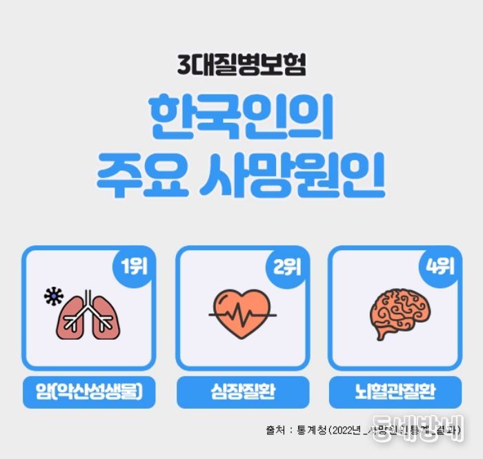 동네방네 김형규 기자 | 3대질병으로 일컬어지는 암, 뇌혈관질환, 심혈관질환은 한국인의 주요 사망원인에서 상위를 차지하고 있으며, 이에 대한 진단비를 집중적으로 보장해 주는 보험상품을 3대질병진단비 보험이라 할 수 있다.