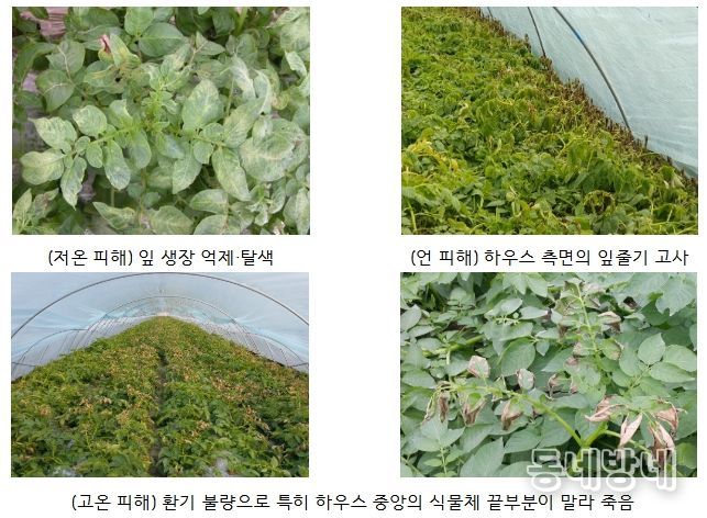 먼저 감자 싹이 트고 잎줄기가 자라는 1월과 2월에는 저온 및 폭설 피해 예방에 집중해야 한다. 시설 내부 온도가 5도(℃) 이하로 떨어지면 감자 생육이 억제되고 잎 색이 변할 수 있다. 또, 온도가 영하로 내려가 찬 공기에 직접 노출되면 식물체가 얼어 회복하지 못하고 잎줄기가 마르며 죽는 언 피해(동해)가 발생할 수 있다.