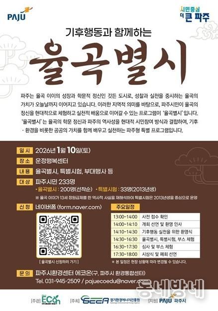 동네방네 김형규 기자 | 파주시환경센터 에코온은 파주를 대표하는 조선시대 사상가 율곡 이이의 학문 정신을 현대적 기후행동 가치로 재해석한 기후문화축제 ‘기후행동과 함께하는 율곡별시’를 오는 10일 운정행복센터에서 개최한다고 밝혔다.
