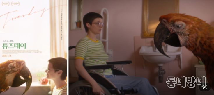먼저 삶과 죽음에 관한 독특한 시선을 담은 영화 '튜즈데이'는 불치병에 걸린 ‘튜즈데이’와 점점 다가오는 딸의 죽음을 거부하는 엄마 ‘조라’ 앞에 모든 죽어가는 존재의 마지막 순간을 배웅하는 앵무새 ‘죽음’이 나타나며 벌어지는 A24 X BBC FILM의 독특한 휴먼 감동 판타지이다.