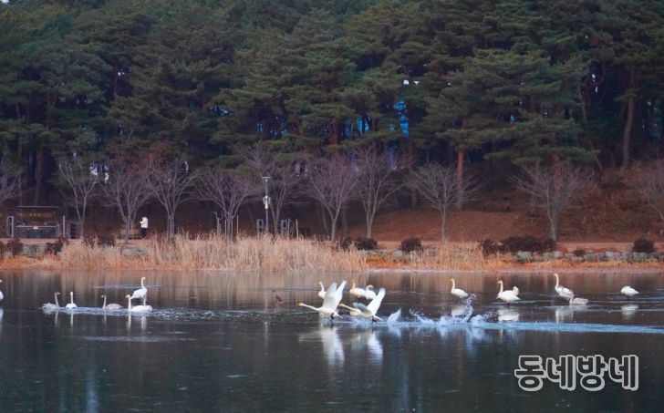 동네방네 김형규 기자 | 맑게 갠 하늘 아래 울진군 연호공원에서 겨울 철새 고니가 힘차게 날아오르고 있다.