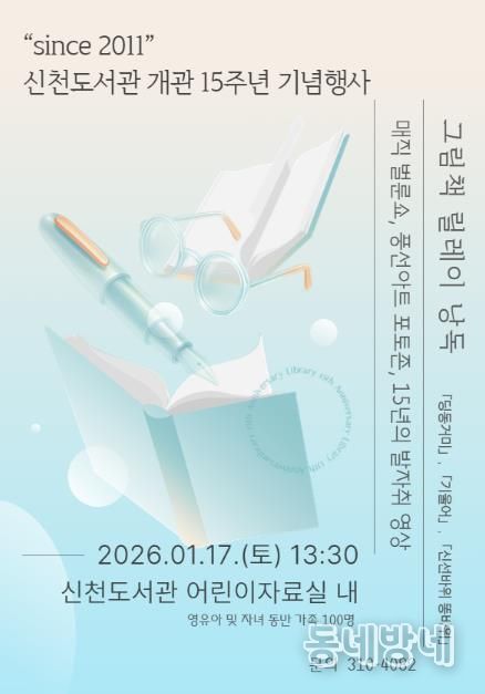 동네방네 김형규 기자 | 시흥시는 오는 1월 17일 신천도서관에서 ‘개관 15주년 기념행사’를 열고, 유아동 및 어린이 동반 가족 100여 명을 대상으로 그림책 낭독과 마술 공연을 운영한다. 행사는 이날 오후 1시 30분부터 3시 30분까지 진행된다.
