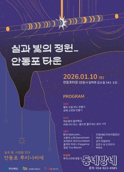 동네방네 김형규 기자 | 안동포타운(다누림협동조합)은 경상북도와 경상북도문화관광공사가 추진하는 ‘2025년 3대문화 콘텐츠 확충 시범사업’에 선정됨에 따라, 2026년 1월 10일부터 2월 21일까지 안동포타운 일원에서 '실과 빛의 정원-안동포 루미나리에'를 운영한다고 밝혔다.