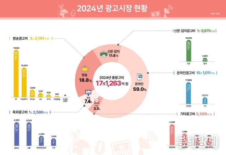 2024년 매체별로 보면 방송 광고비가 3조 2,191억 원으로 전체 광고비의 18.8%를 차지하고 있으며, 온라인 광고비 10조 1,011억 원으로 59.0%, 신문·잡지 광고가 1조 9,875억 원으로 11.6%, 옥외 광고는 1조 2,591억 원으로 7.4%로 집계됐다.