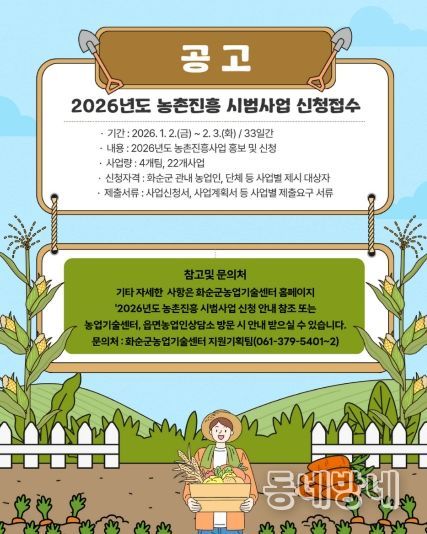 동네방네 김형규 기자 | 화순군은 “소득이 높은 부유 농촌” 실현과 화순 농업 경쟁력 강화를 위해 ‘2026년도 농촌진흥 시범사업’ 신청을 2026년 2월 3일까지 신청받는다고 밝혔다.