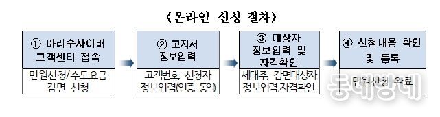신청방법은 방문신청 또는 온라인신청이 가능하다. 방문 신청은 1월 12일부터 감면받을 주소지 관할 동주민센터에서 우선 접수하며, 온라인 신청은 3월 3일부터 서울아리수본부 누리집 내 아리수 사이버고객센터에서 할 수 있다.