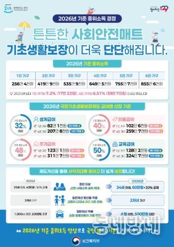 2026년도 기준중위소득은 4인가구 기준 6.51%로 역대 최대 인상되며, 기초생계급여 지원액도 4인가구 기준 195만 1,287원에서 최대 207만 8,320원으로 인상 지원한다.