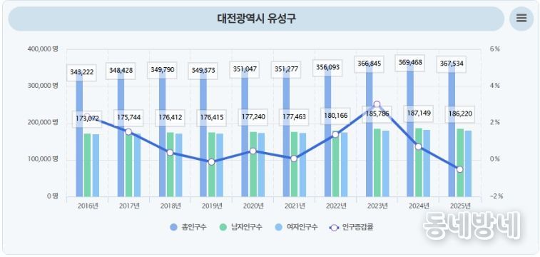행정안전부 주민등록 인구통계 분석 결과, 유성구 인구는 10년 전인 지난 2016년(이하 12월 31일 기준) 34만 3,222명에서 2025년에는 36만 7,534명으로 2만 4,312명이 증가(증가율 7.1%)했다.