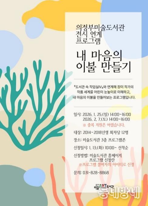 신청은 1월 13일 오전 10시부터 의정부미술도서관 누리집에서 선착순으로 접수한다. 자세한 운영 일정과 세부 내용은 누리집에서 확인할 수 있다.