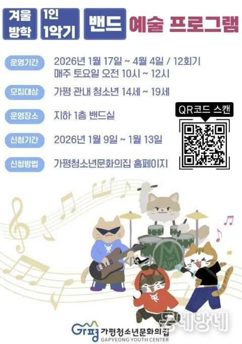 동네방네 김형규 기자 | 가평청소년문화의집은 1월 9일부터 13일까지 ‘1인 1악기 밴드 프로그램’에 참여할 청소년을 모집한다고 12일 밝혔다.