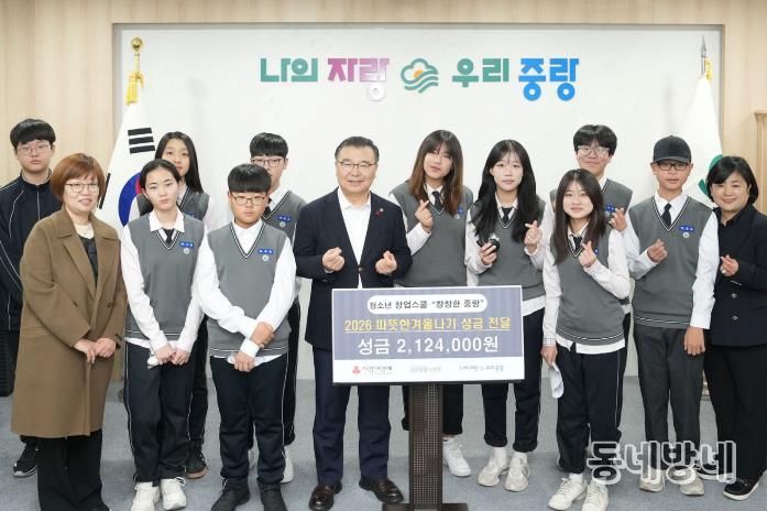 동네방네 김형규 기자 | 중랑구 사회적경제지원센터에서 운영한 청소년 창업스쿨 ‘창창한 중랑’ 참가 학생들이 창업 활동을 통해 마련한 수익금 200만 원 전액을 지역사회에 기부했다. 이번 기부는 ‘2026 따뜻한 겨울나기’ 성금 전달식을 통해 이뤄졌다.