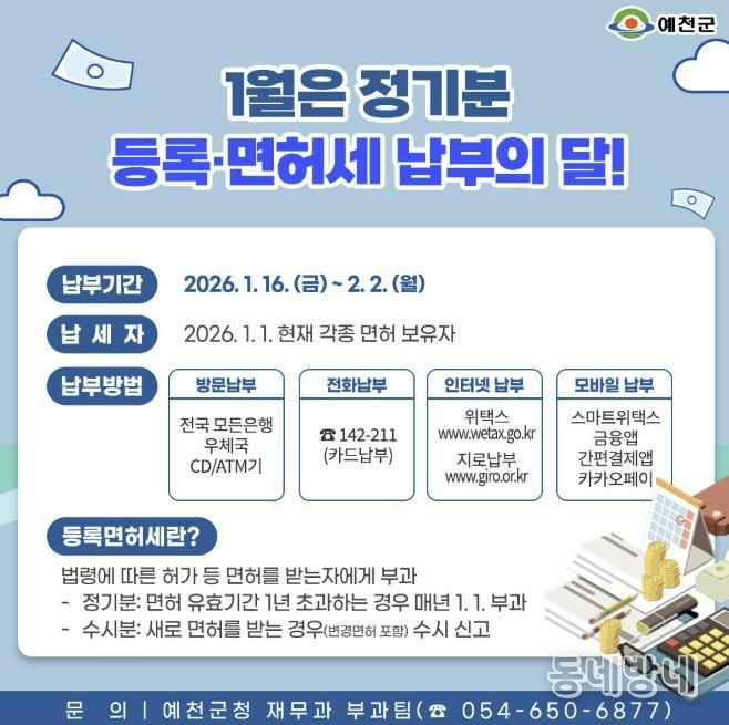 동네방네 김형규 기자 | 예천군은 정기분 등록면허세 13,922건, 1억 9천8백만 원을 부과했다고 13일 밝혔다.