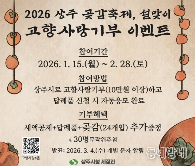 동네방네 김형규 기자 | 상주시는 2026 상주곶감축제 및 설 명절을 맞이하여 1월 15일부터 2월 말까지 고향사랑기부 이벤트를 실시한다.